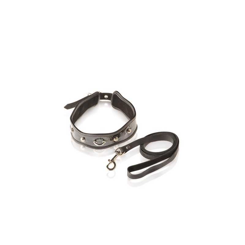 Collier tout doux avec une finition en vernis noir et strass accompagné de son indispensable laisse en cuir également avec poignée et mousqueton métal pour l'attache.