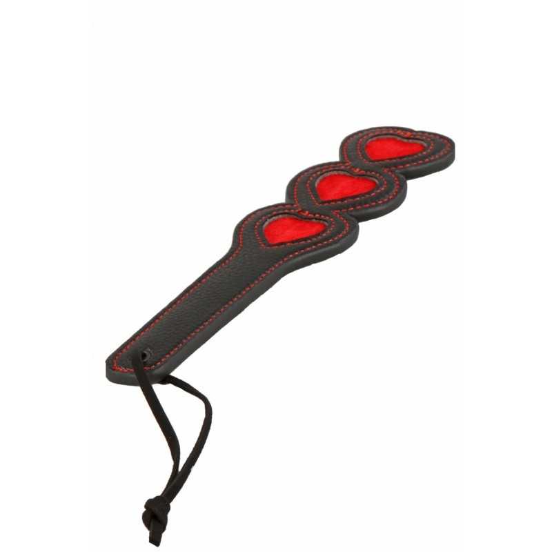 Paddle noir avec ses surpiqures rouges et ses trois coeurs rouges. Dragonne.