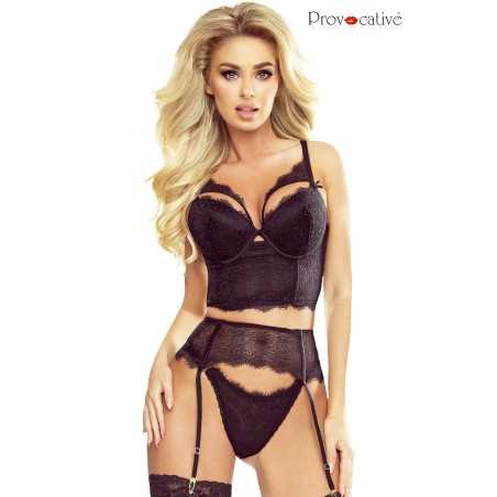Ensemble féminin en dentelle noire composé d'un soutien gorge bustier et slip.